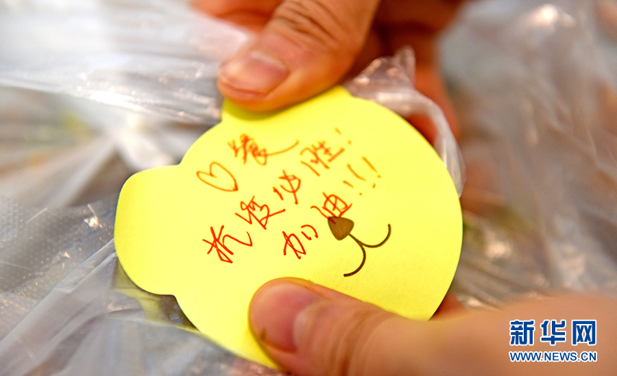 4月13日,刘云在做好的爱心餐上贴上“抗疫必胜”便利贴纸,为社区抗疫一线人员加油。