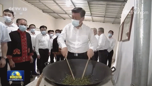 考察时,习近平来到村民家中,在手工茶坊参与炒茶劳动并买下两袋茶叶,勉励他们把茶叶经营好,把日子过得更红火。