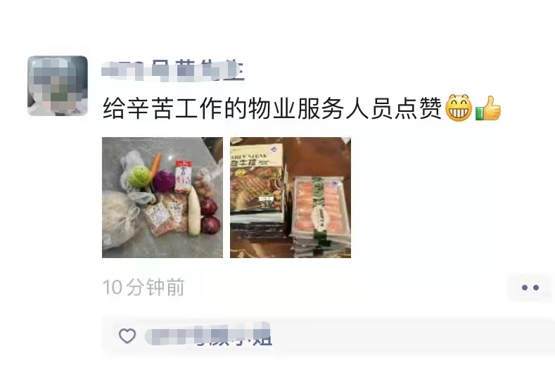 “居民们送来的什么都有,蔬菜、水果,半成品的鱼香肉丝、蹄髈……太多了,我都数不清了。”小区物业经理黄海华说。