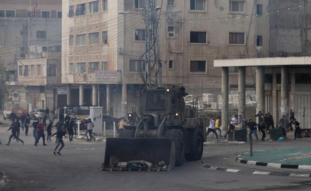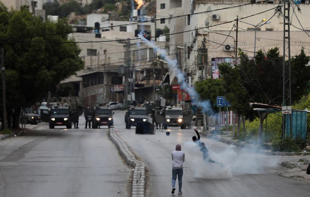 4月13日,在约旦河西岸城市纳布卢斯,巴勒斯坦人与以色列军队发生冲突。(新华社发,艾曼·诺巴尼 摄)