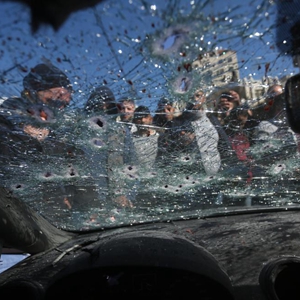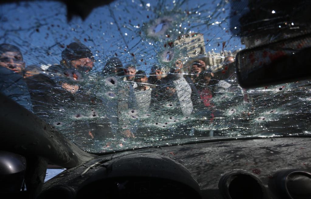 2月8日,在约旦河西岸城市纳布卢斯,人们聚集在被以军打死的3名巴勒斯坦人的车旁。(新华社发,艾曼·诺巴尼 摄)