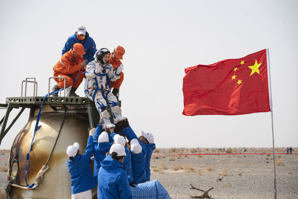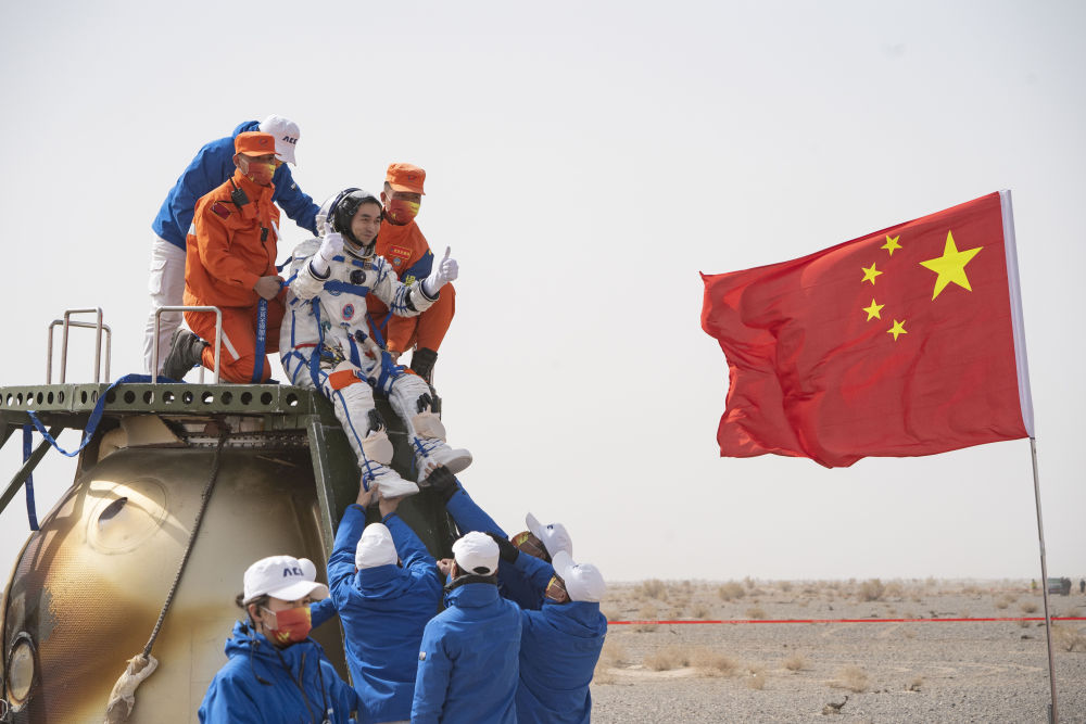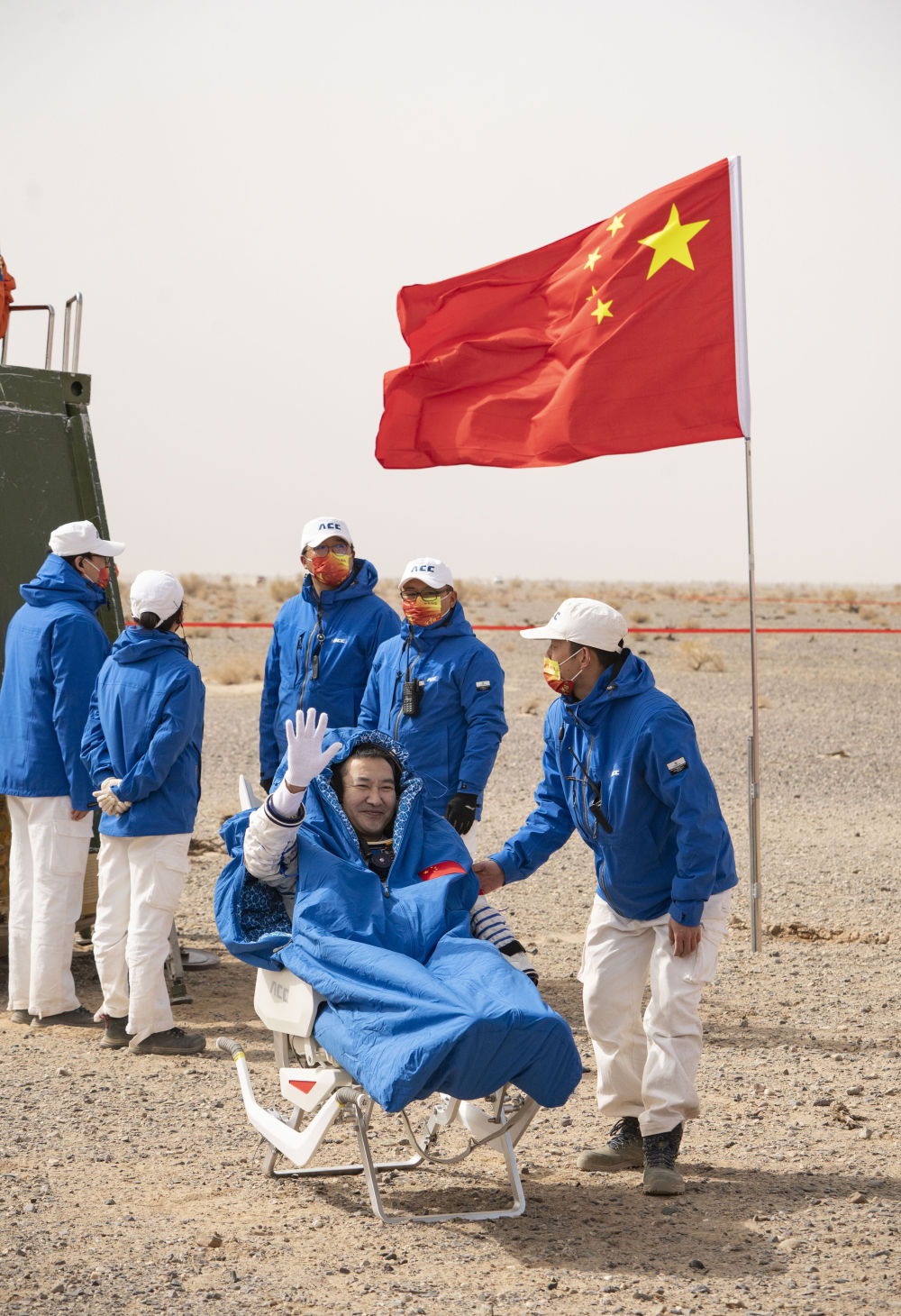 ↑4月16日,神舟十三号载人飞船返回舱在东风着陆场成功着陆。这是航天员翟志刚安全顺利出舱。