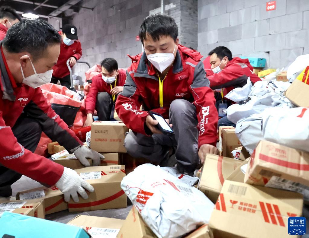 4月17日,罗明(前右)在京东上海曲阳营业部对到站货物进行验货。