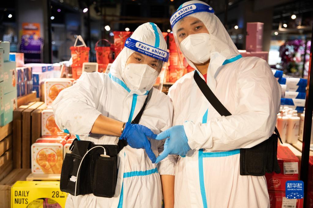 4月15日,在上海长宁区盒马星空广场门店,曹冉(右)和徐清秋比出爱心。