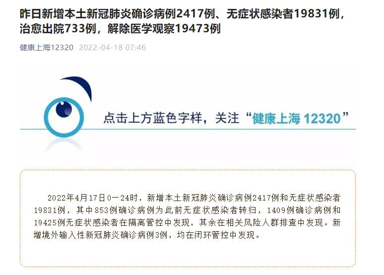 2022年4月17日0—24时,上海新增本土新冠肺炎确诊病例2417例和无症状感染者19831例,其中853例确诊病例为此前无症状感染者转归,1409例确诊病例和19425例无症状感染者在隔离管控中发现,其余在相关风险人群排查中发现。新增境外输入性新冠肺炎确诊病例3例,均在闭环管控中发现。