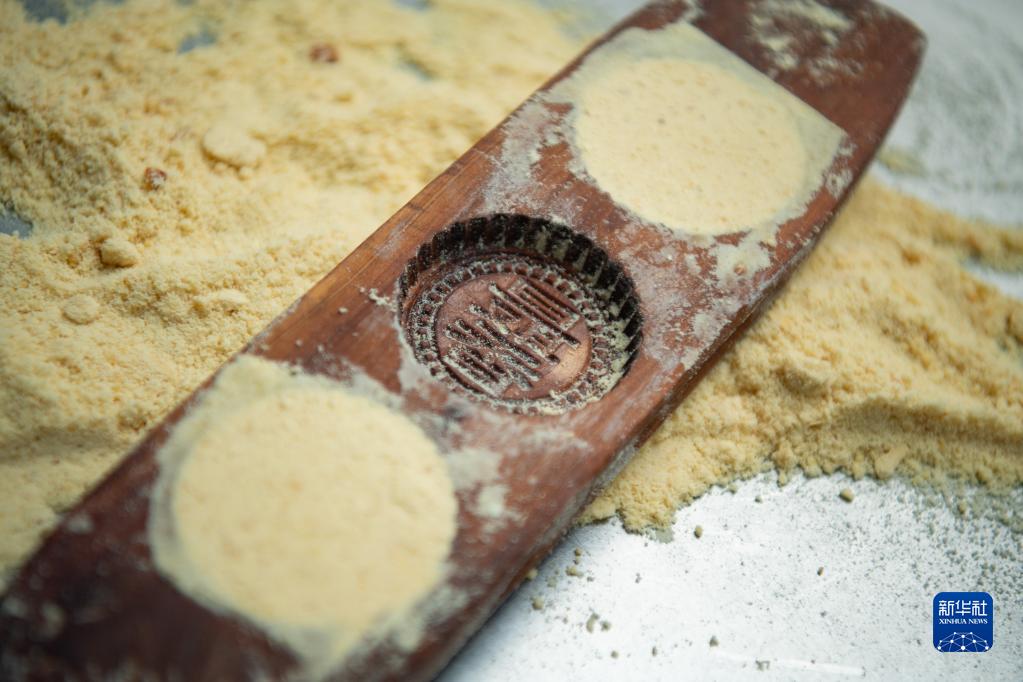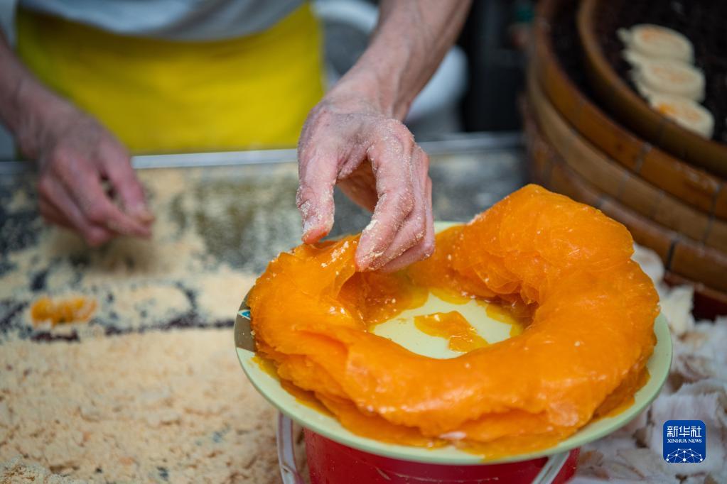 4月14日,“最香饼家”师傅在做传统的蛋黄肉心杏仁饼。新华社记者 张金加 摄