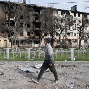 4月17日,在马里乌波尔,当地居民走过被损坏的建筑。新华社发(维克托摄)