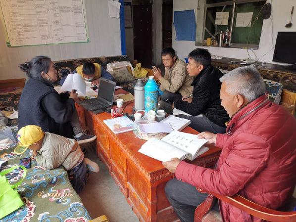 在特布拉村,驻村第一书记吉宗(女,左一)正与其他村干部开会,商讨农村厕所改造事宜。新华社记者 林建杨 摄(手机照片,4月16日摄)