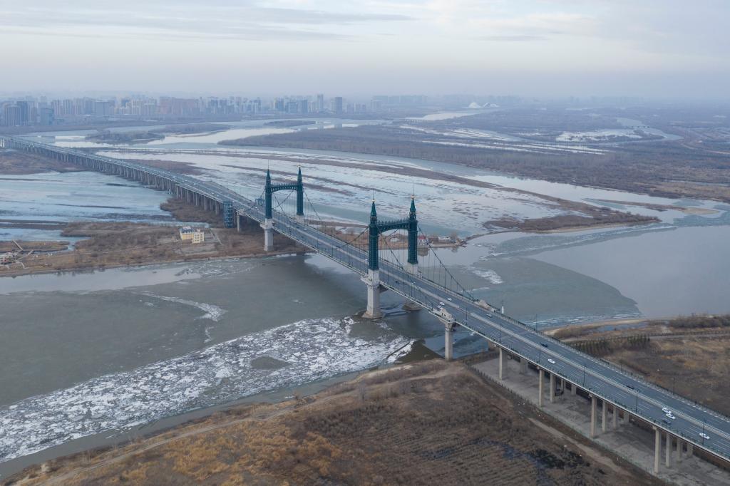 4月8日拍摄的松花江哈尔滨段江面(无人机照片)。新华社记者 谢剑飞 摄