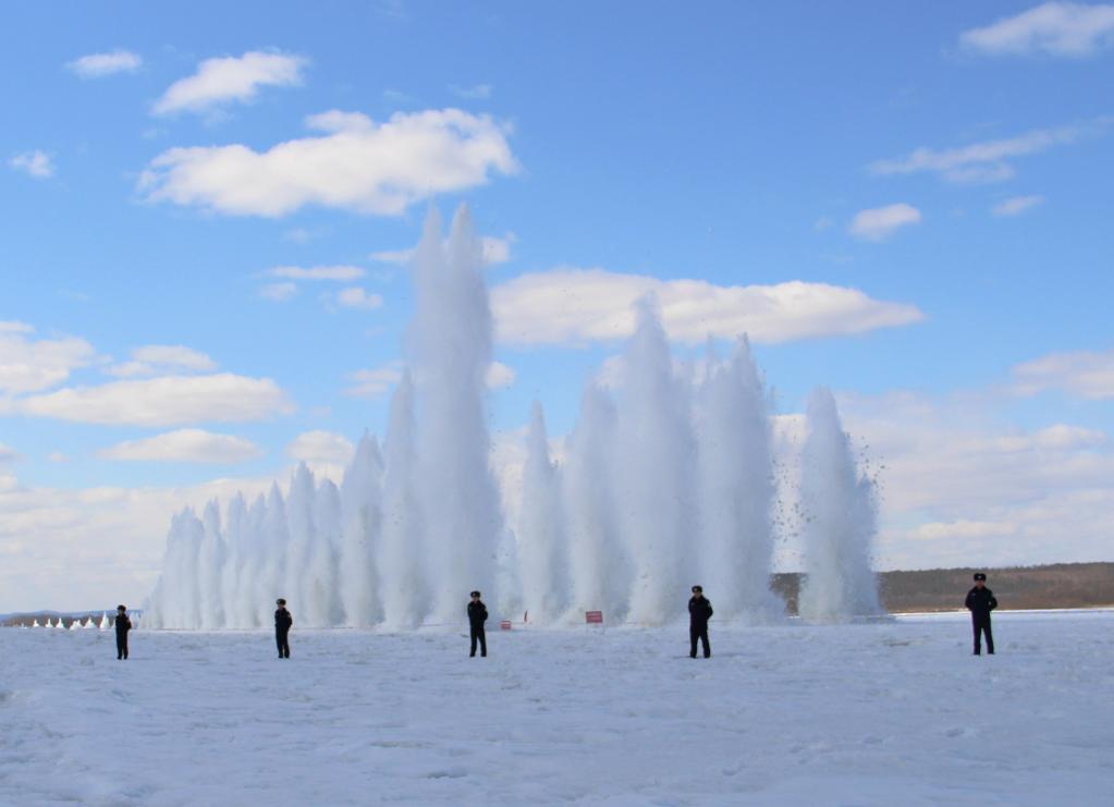 在爆破员的指令下,伴着巨响,一道道夹着冰的水柱瞬时冲上几十米高的天空,浩浩荡荡的气势仿佛万马奔腾,冰封的江面与天空霎时模糊了边界……这是黑龙江干流漠河段在进行防凌破冰。