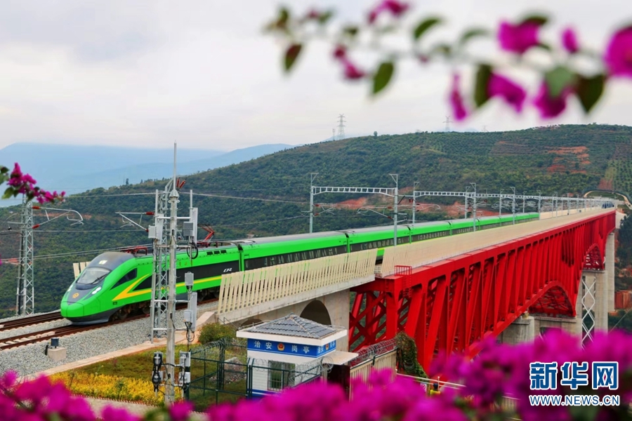 中老铁路元江特大桥,“绿巨人”与红色的桥身、紫色的山花相映成景。新华网发(徐章位/摄)