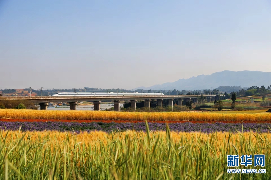 嵩明县小新街附近,一列“和谐号”奔驰过金黄的麦田和紫色的花田。新华网发(徐章位/摄)