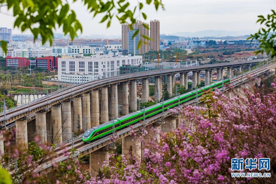 三四月间的云南,处处繁花,开行在云岭大地上的列车,时不时就“邂逅”烂漫的山花或成片的花田。跟随摄影师的镜头,看“米轨绿皮车”、普速列车、“复兴号”动车组等不同型号、不同颜色、不同速度的列车,穿越花海时的绝美瞬间。图为在昆明拍摄到的“和谐号”与花儿同框画面。新华网发(徐章位/摄 赵熠/文)