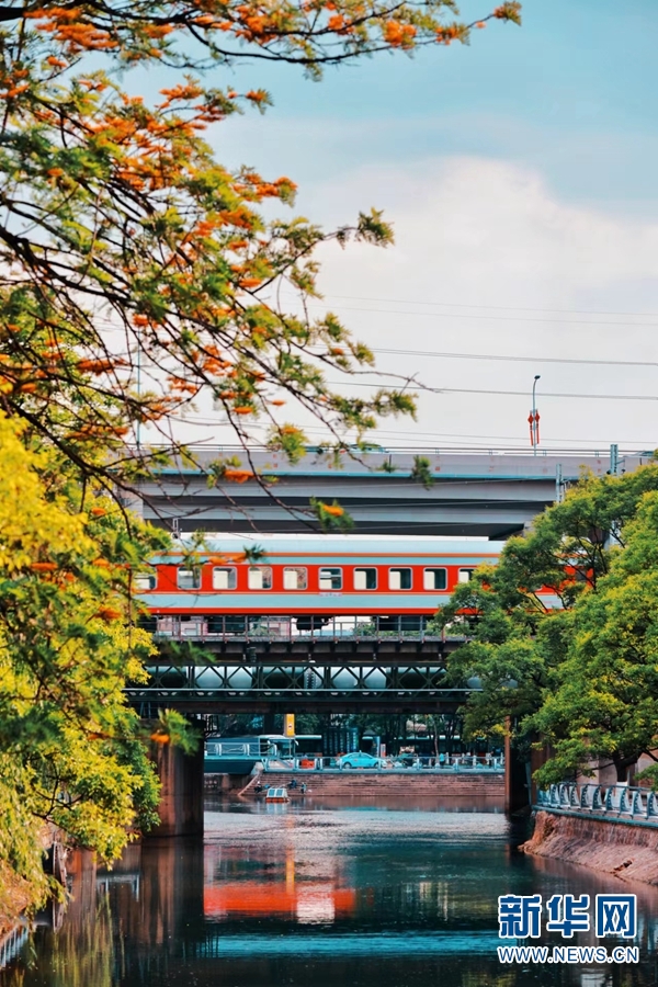昆明大观河,一列普速列车驶过,与两岸的绿树繁花相映成景。新华网发(徐章位/摄)