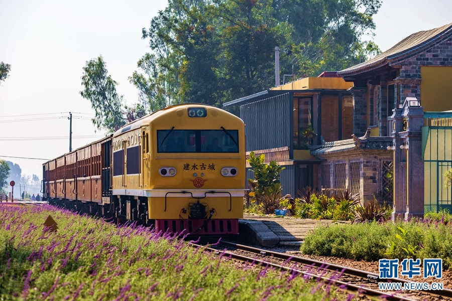 建水县内开行的观光型米轨小火车“古城黄”,复古的车身与沿途的淡紫色花田相映成景。新华网发(徐章位/摄)