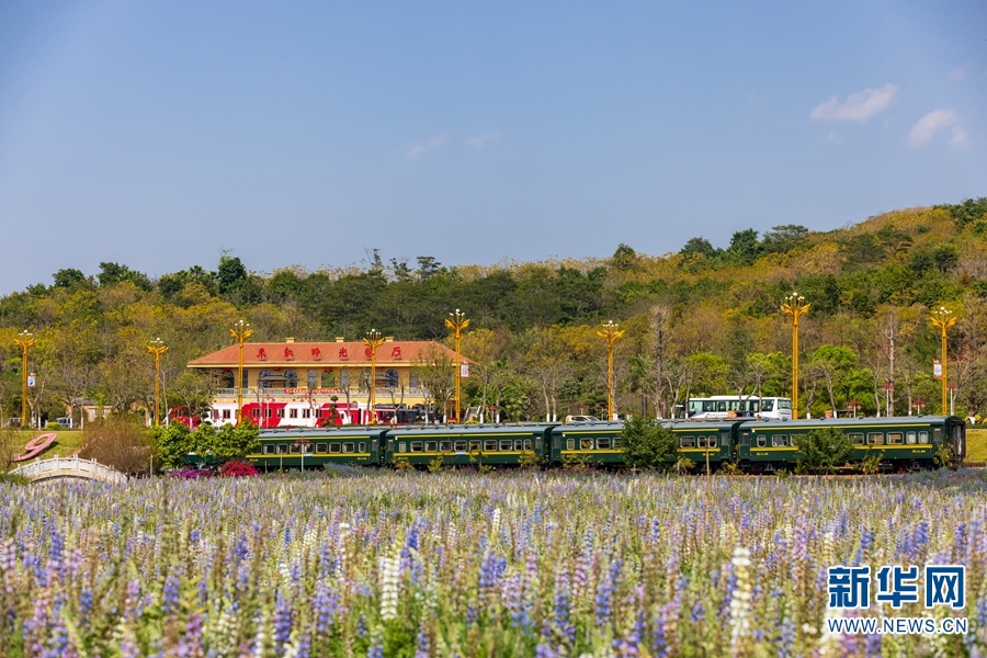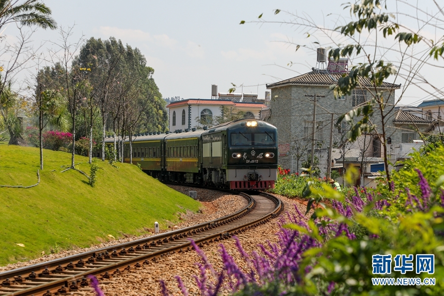 开远市内开行的“青山绿”米轨小火车,缓缓驶过沿途的一丛丛繁花。与用于观光的“古城黄”米轨小火车不同,这趟列车使用标准米轨客车车辆,高度还原了米轨客车乘坐体验。新华网发(刘昊亮/摄)