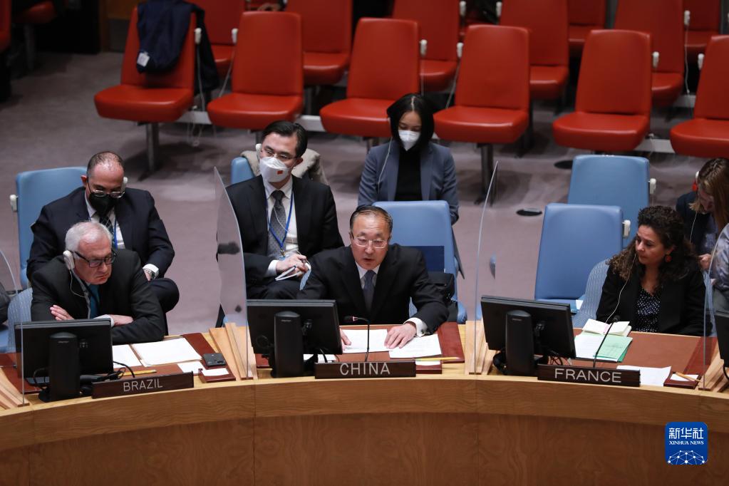 4月19日,在位于纽约的联合国总部,中国常驻联合国代表张军(前排中)在联合国安理会审议乌克兰人道问题时发言。新华社记者 谢锷 摄