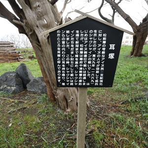 松前城下有一座三大块黑石堆砌而成的耳冢。冢旁竖着一块牌子介绍这座耳冢的来历:面对松前藩对阿伊努族的残酷压迫,1669年,阿伊努人民团结起来反抗,史称沙牟奢允(阿伊努族首领)之战。阿伊努一方开始占有优势,但松前藩得到幕府和津轻藩援助并将沙牟奢允诱杀。松前藩割下沙牟奢允等人的耳朵代为首级带回,葬于此,故称耳冢。