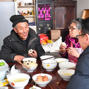 段村村民蔡文明(左)和家人在家中用早餐。(新华社记者柴婷摄)