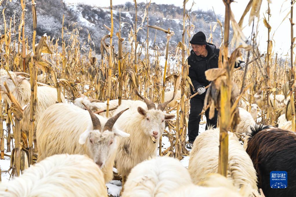 在山西省汾西县僧念镇段村,脱贫户蔡文明在山上放羊(1月27日摄)。新华社记者 柴婷 摄