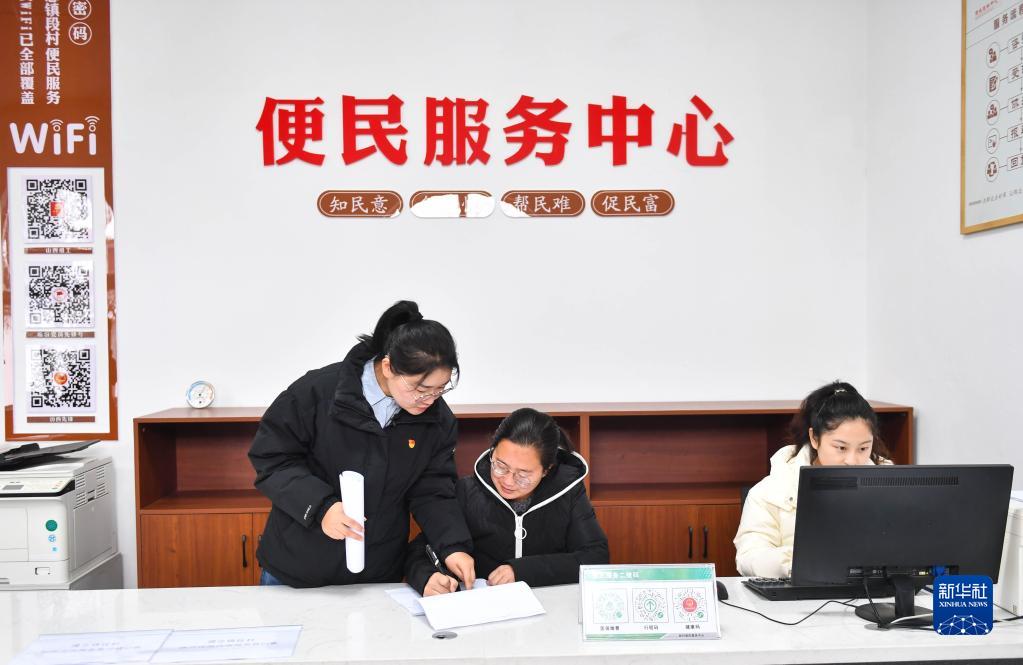 在山西省汾西县僧念镇段村,村党支部书记李佳莉(中)在村委会处理事务(1月27日摄)。 新华社记者 柴婷 摄