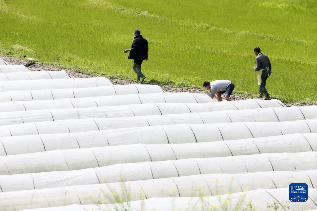 4月20日,重庆市黔江区邻鄂镇高坪村村民在管护稻秧育苗床。