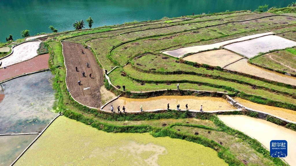 4月20日,村民在贵州省黔东南苗族侗族自治州榕江县古州镇田间劳作(无人机照片)。