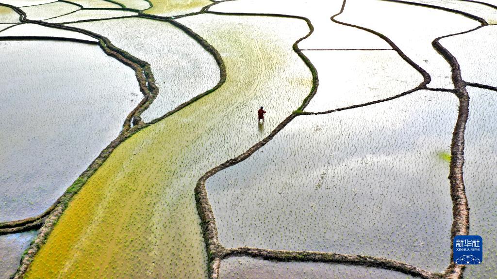 4月20日,江西省吉安市永丰县七都乡车头村农民进行田间管理(无人机照片)。