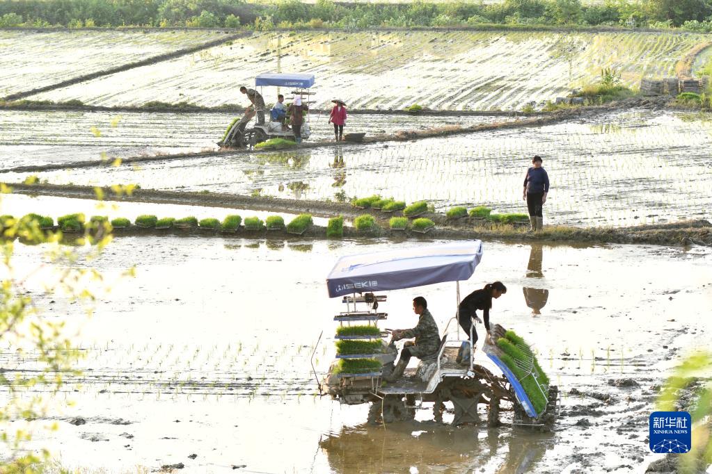 4月20日,在湖南省双峰县永丰街道金田村,农民驾驶插秧机移栽早稻秧苗。