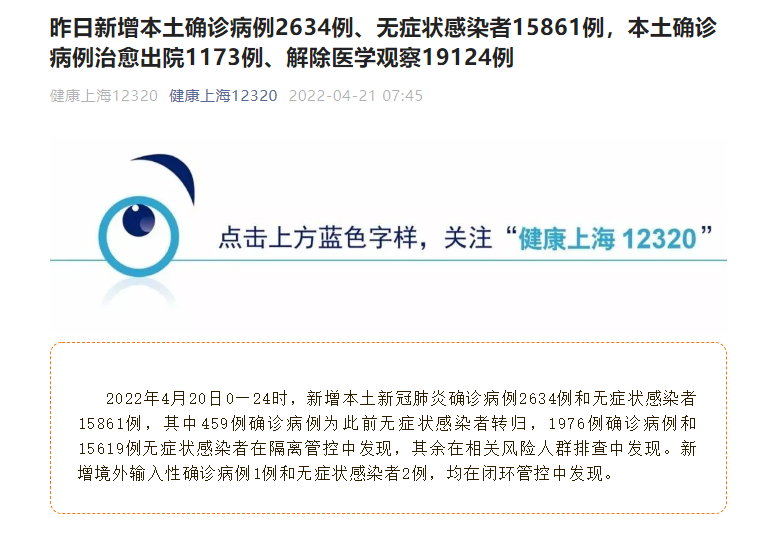 昨日上海新增本土确诊病例2634例、无症状感染者15861例,本土确诊病例治愈出院1173例、解除医学观察19124例