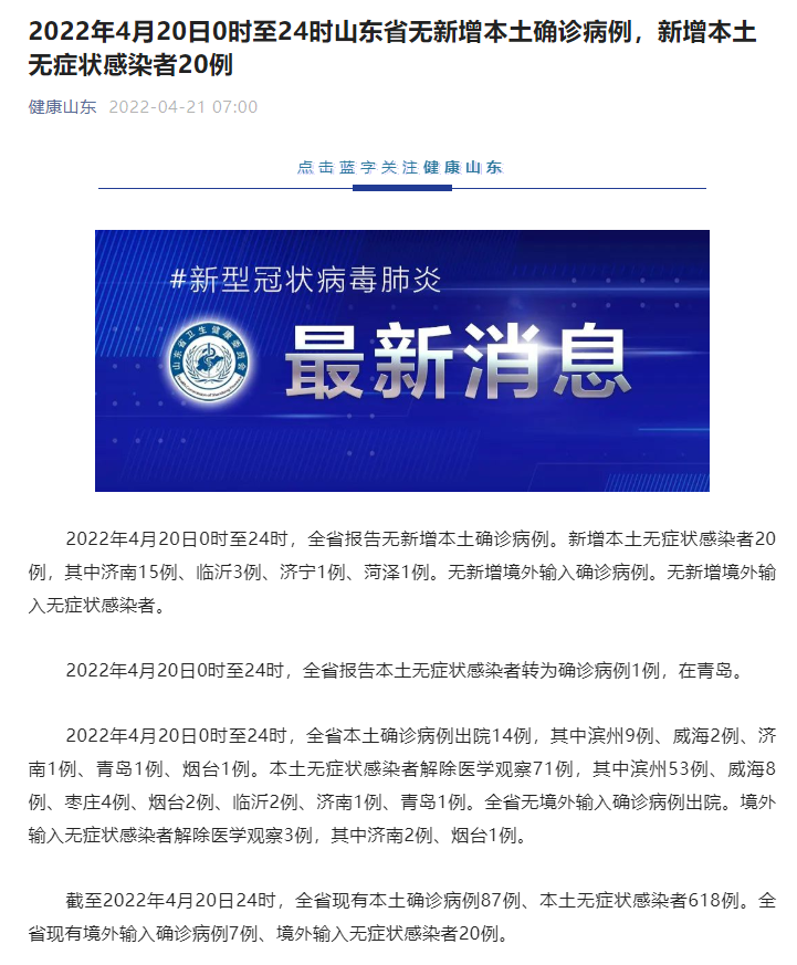 2022年4月20日0时至24时山东省无新增本土确诊病例,新增本土无症状感染者20例
