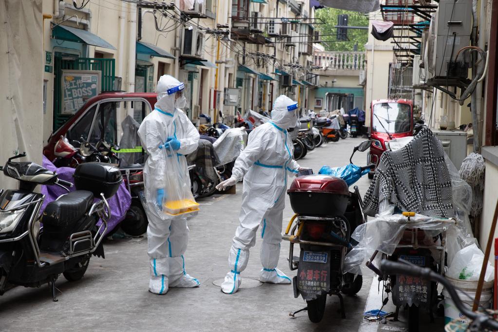 4月20日中午,安排居民做完核酸检测后,广福居委会主任张华(左)回到居委会,脱去防护服。新华社记者 金立旺 摄