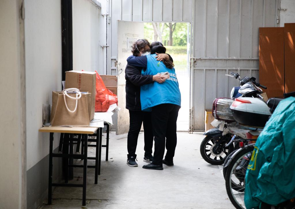 紧邻的宝带居民区党总支书记张萍前来探望广福居民区党总支书记杨树萍,两人在门口紧紧拥抱在一起,张萍哭了。前段时间疫情的波动,给她们带来很大的压力,互相的慰藉显得尤为重要。杨树萍安慰张萍:“我们拼命地干,一起努力,一定能把这个疫情控制住。”