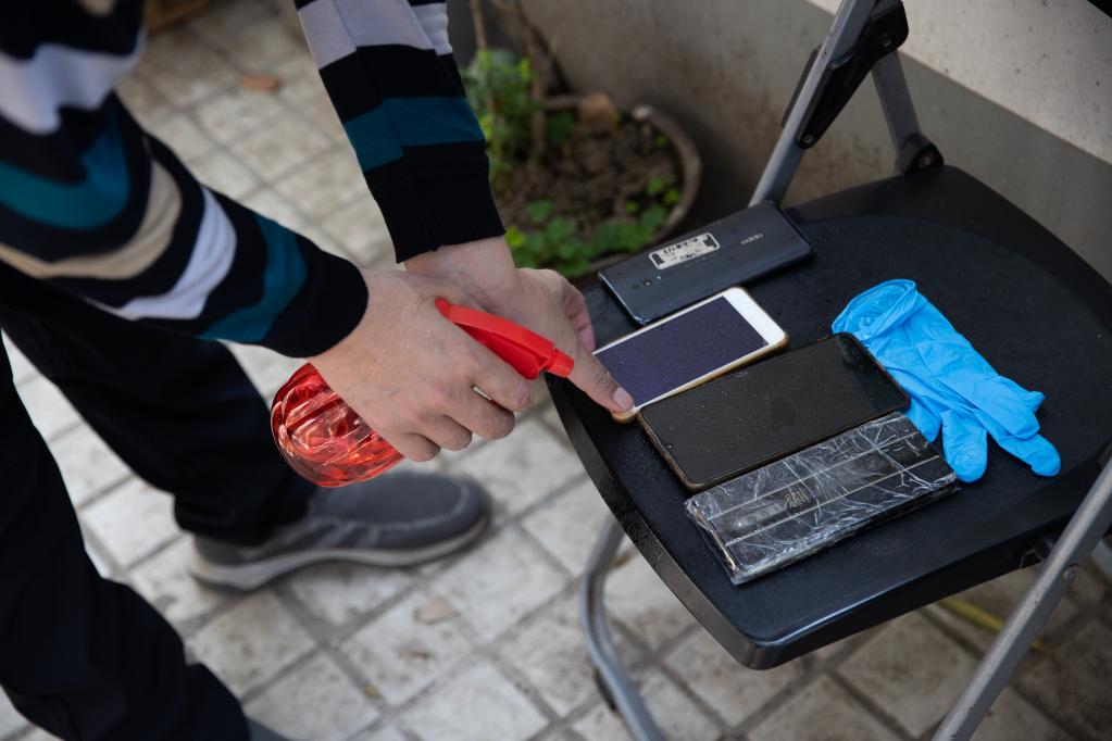 4月20日中午,安排居民做完核酸检测后,广福居委会工作人员袁勇军在消杀手机。新华社记者 金立旺 摄