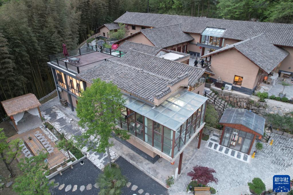佛坪县西岔河镇银厂沟村一家民宿(4月19日摄,无人机照片)。
