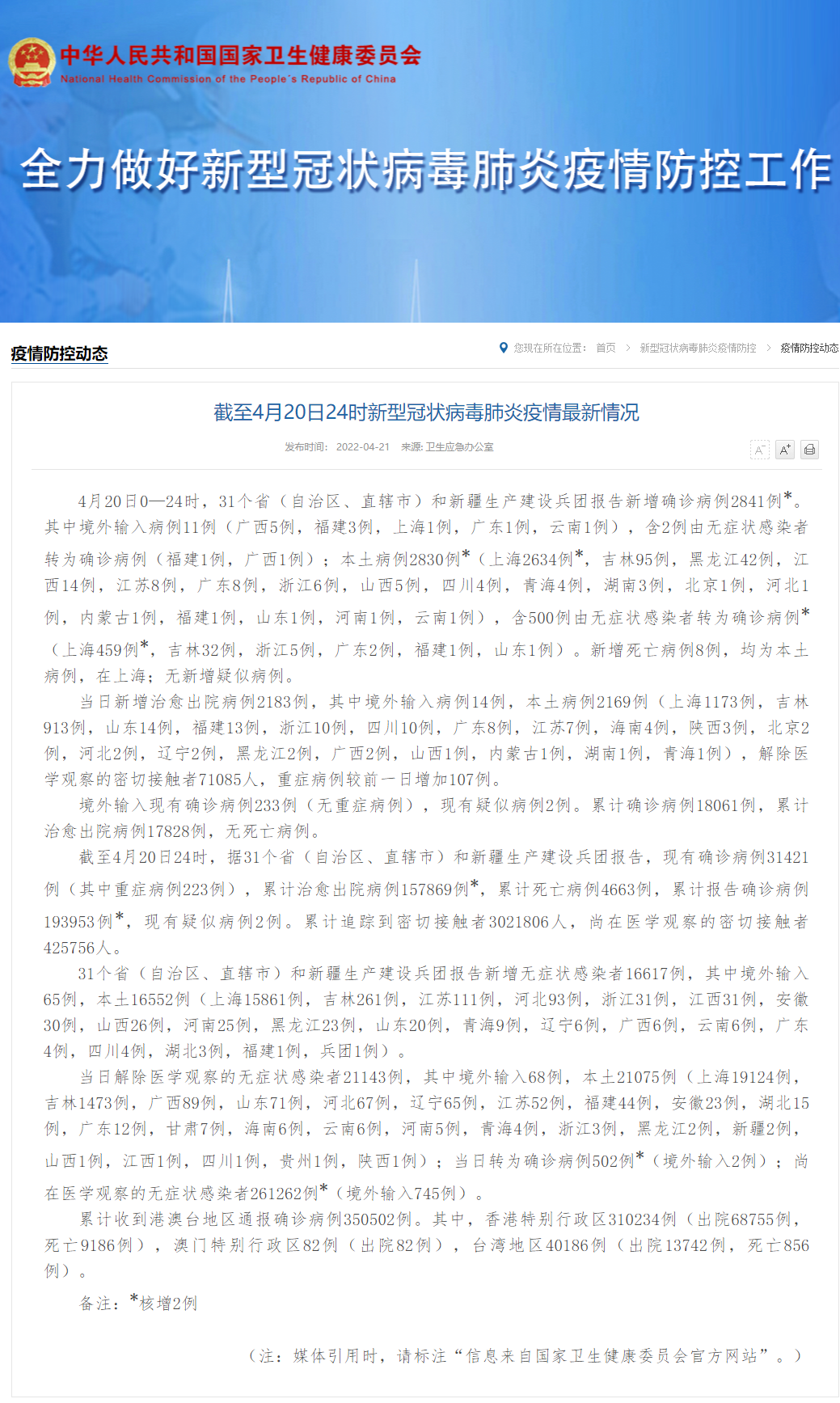 4月20日0—24时,31个省(自治区、直辖市)和新疆生产建设兵团报告新增确诊病例2841例*。其中境外输入病例11例(广西5例,福建3例,上海1例,广东1例,云南1例),含2例由无症状感染者转为确诊病例(福建1例,广西1例);本土病例2830例*(上海2634例*,吉林95例,黑龙江42例,江西14例,江苏8例,广东8例,浙江6例,山西5例,四川4例,青海4例,湖南3例,北京1例,河北1例,内蒙古1例,福建1例,山东1例,河南1例,云南1例),含500例由无症状感染者转为确诊病例*(上海459例*,吉林32例,浙江5例,广东2例,福建1例,山东1例)。新增死亡病例8例,均为本土病例,在上海;无新增疑似病例。
