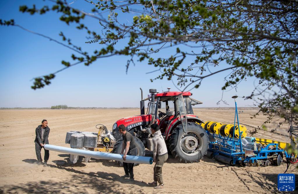 在新疆沙湾市大泉乡叶家湖村,几名工人在棉田搬运播种时要使用的地膜(4月16日摄)。
