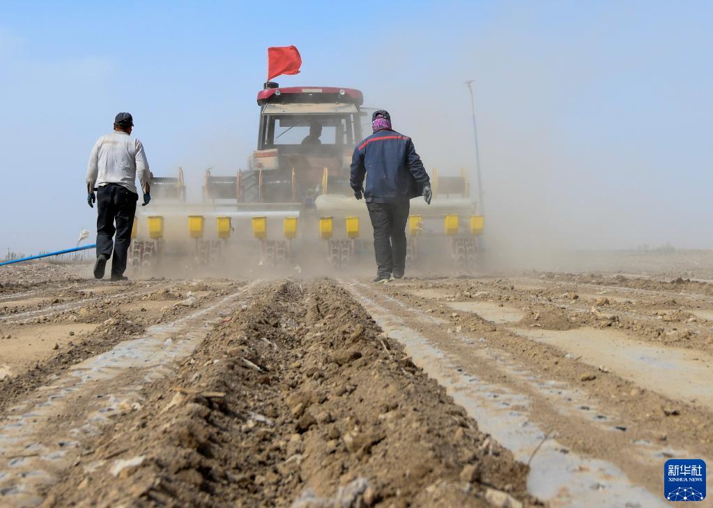 在新疆生产建设兵团第六师共青团农场,棉农在查看播种情况(4月19日摄)。