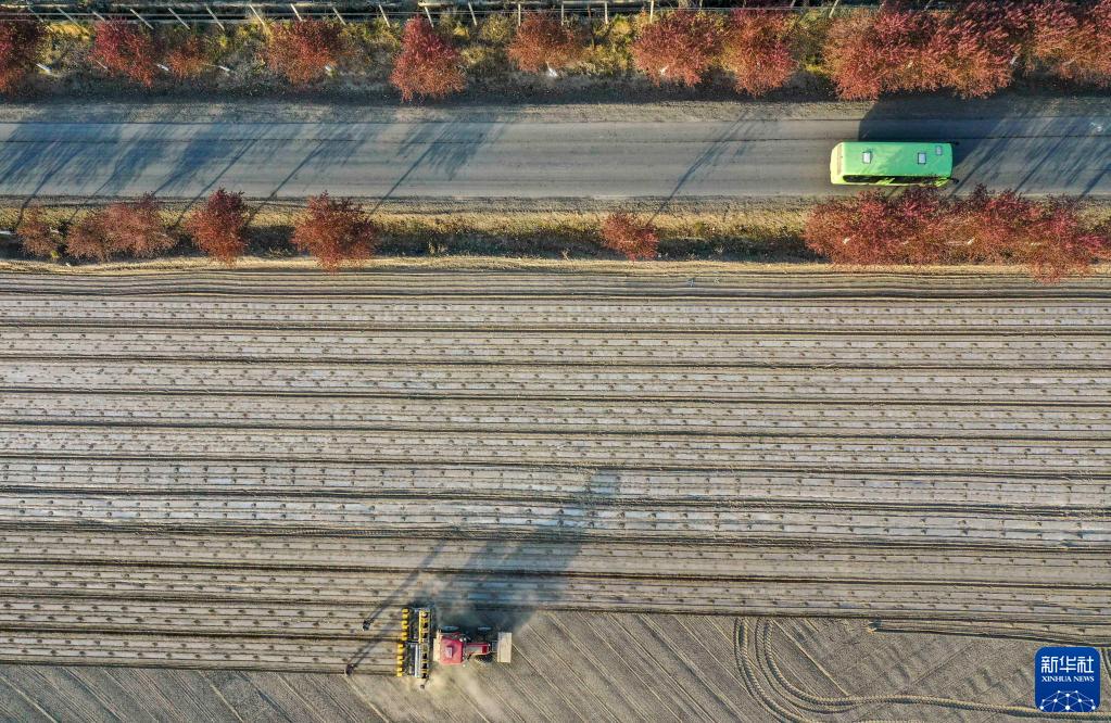在新疆沙湾市大泉乡中泉村,棉农在地里播种;一辆载着播种工人的客车驶过棉田旁的乡村公路(4月18日摄,无人机照片)。