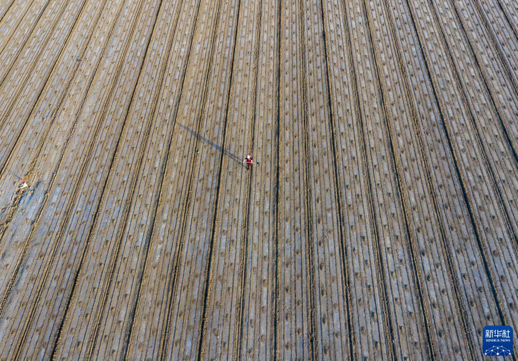 在新疆沙湾市大泉乡中泉村,棉农在一处已播种完的棉田查看地膜覆土情况(4月18日摄,无人机照片)。