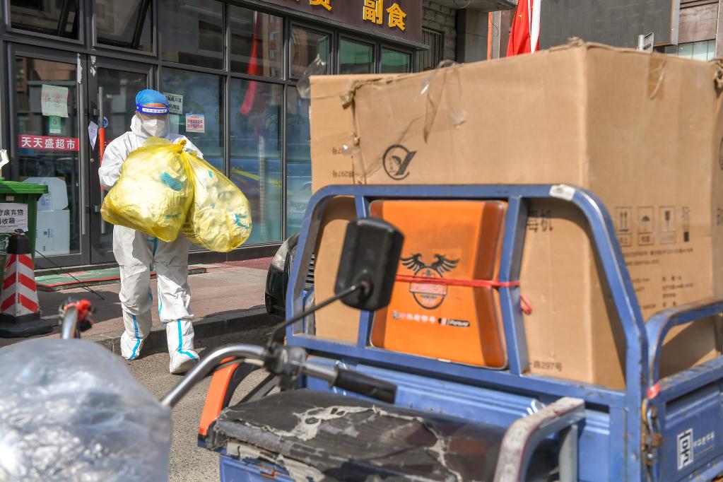4月20日下午,宿国利正在小区里帮助回收垃圾。(新华社记者张楠 摄)