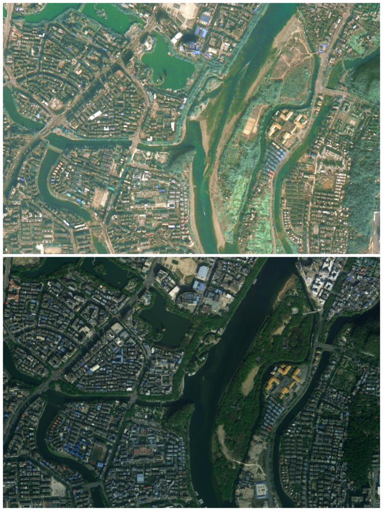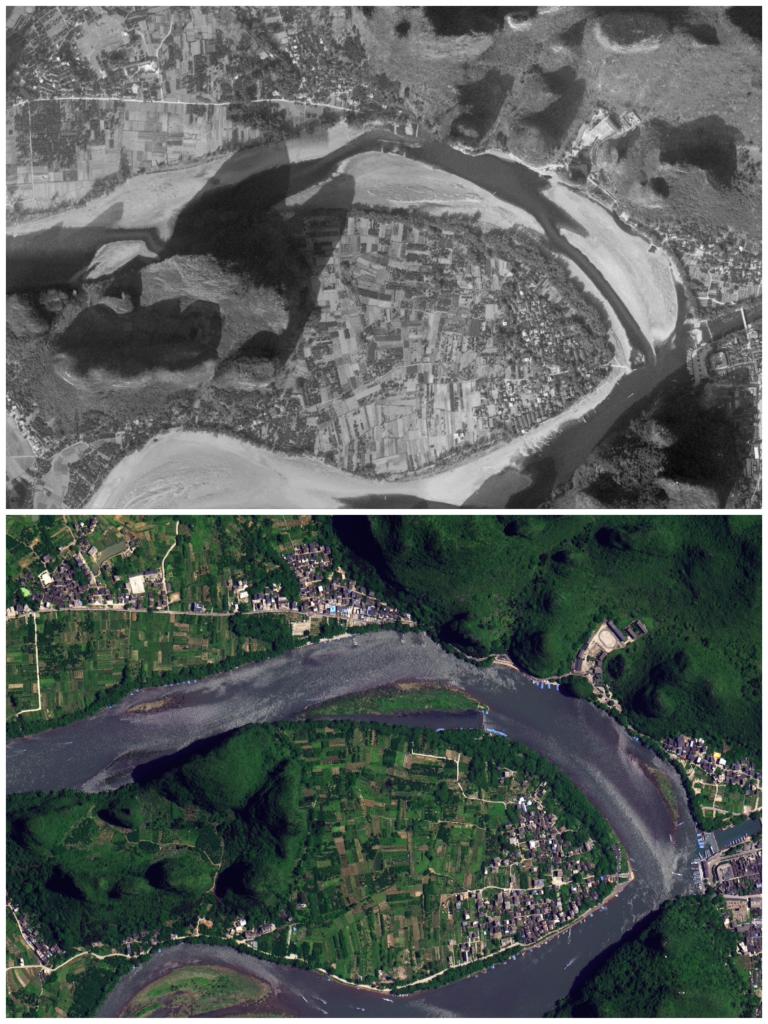桂林市阳朔县兴坪古镇大河背村的对比图片,上图拍摄于2006年11月,下图拍摄于2021年6月。(图片来源:广西自然资源遥感院/自然资源广西卫星应用技术中心)