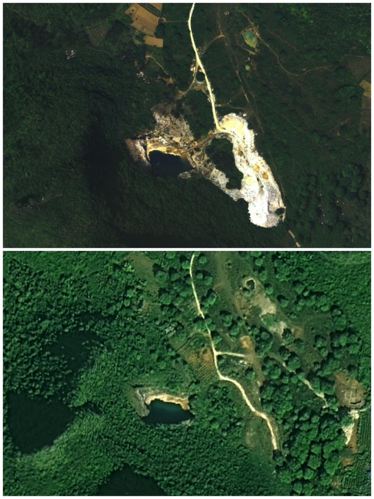 桂林市雁山区一个采石场的对比图片,上图拍摄于2015年4月,下图拍摄于2021年10月。(图片来源:广西自然资源遥感院/自然资源广西卫星应用技术中心)