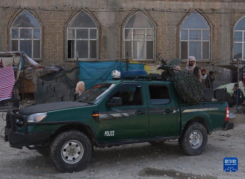 4月21日,一辆警车停在阿富汗马扎里沙里夫遭炸弹袭击的清真寺外。新华社发(卡瓦·巴沙拉特摄)