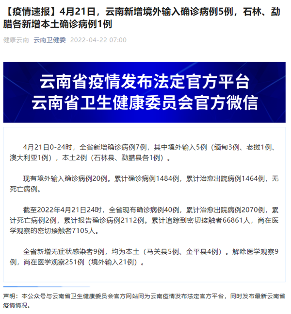 4月21日0-24时,云南省新增确诊病例7例,其中境外输入5例(缅甸3例、老挝1例、澳大利亚1例),本土2例(石林县、勐腊县各1例)。