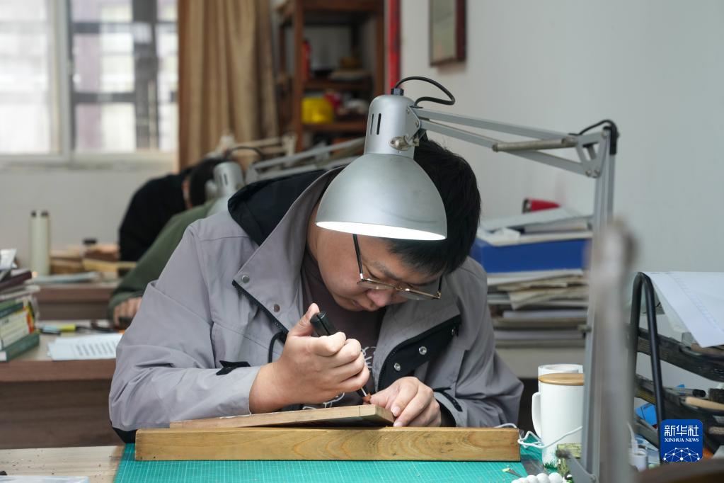 王康(前)和同事们在金陵刻经处技艺展示区内镌刻(4月19日摄)。