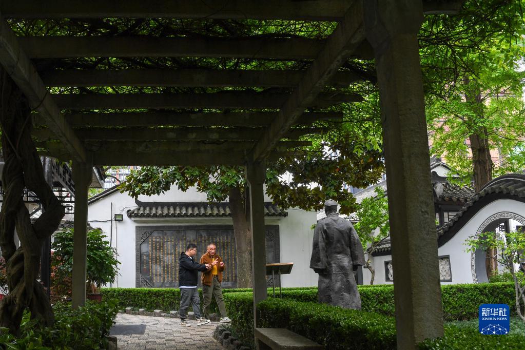 王康(左)和他的师傅马萌青在金陵刻经处散步、讨论技艺(4月15日摄)。新华社记者 李博 摄