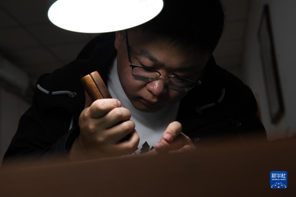 王康在金陵刻经处技艺展示区内进行镌刻(4月15日摄)。新华社记者 李博 摄