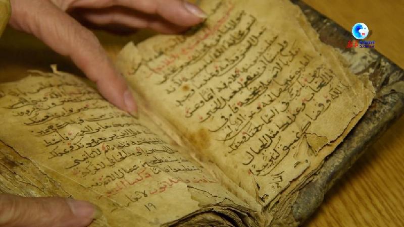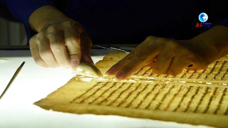 在叙利亚大马士革老城的一间工作室里,古籍修复师拉贾·拉杰哈在发光的桌板前专注地修复一张破损的古籍纸张。