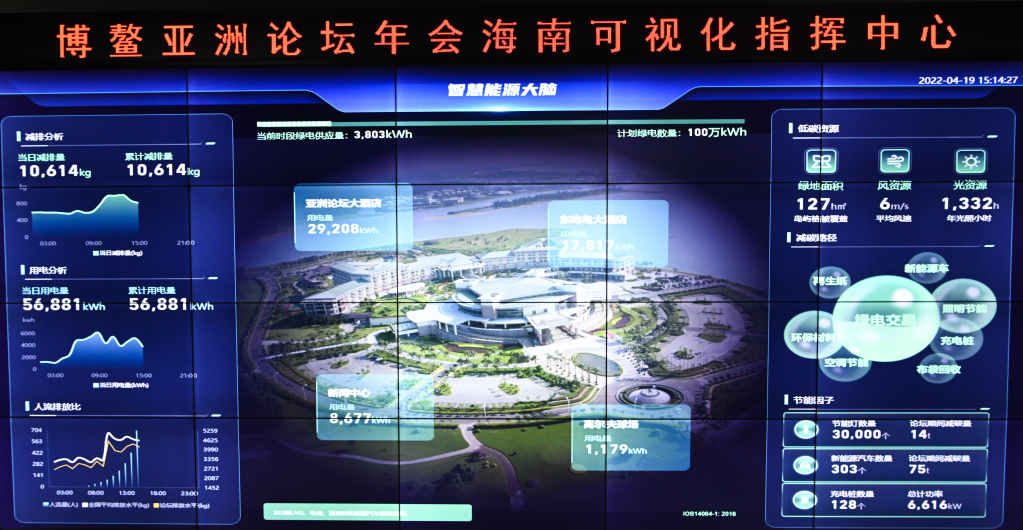博鳌亚洲论坛年会海南可视化指挥中心设立专门的数字化绿色低碳模块,该数字化模块采用由金风科技提供的“智慧能源大脑”平台,通过数字化手段清晰统计大会各项绿色降碳指标,为大会装上低碳“引擎”。新华社记者 杨冠宇 摄